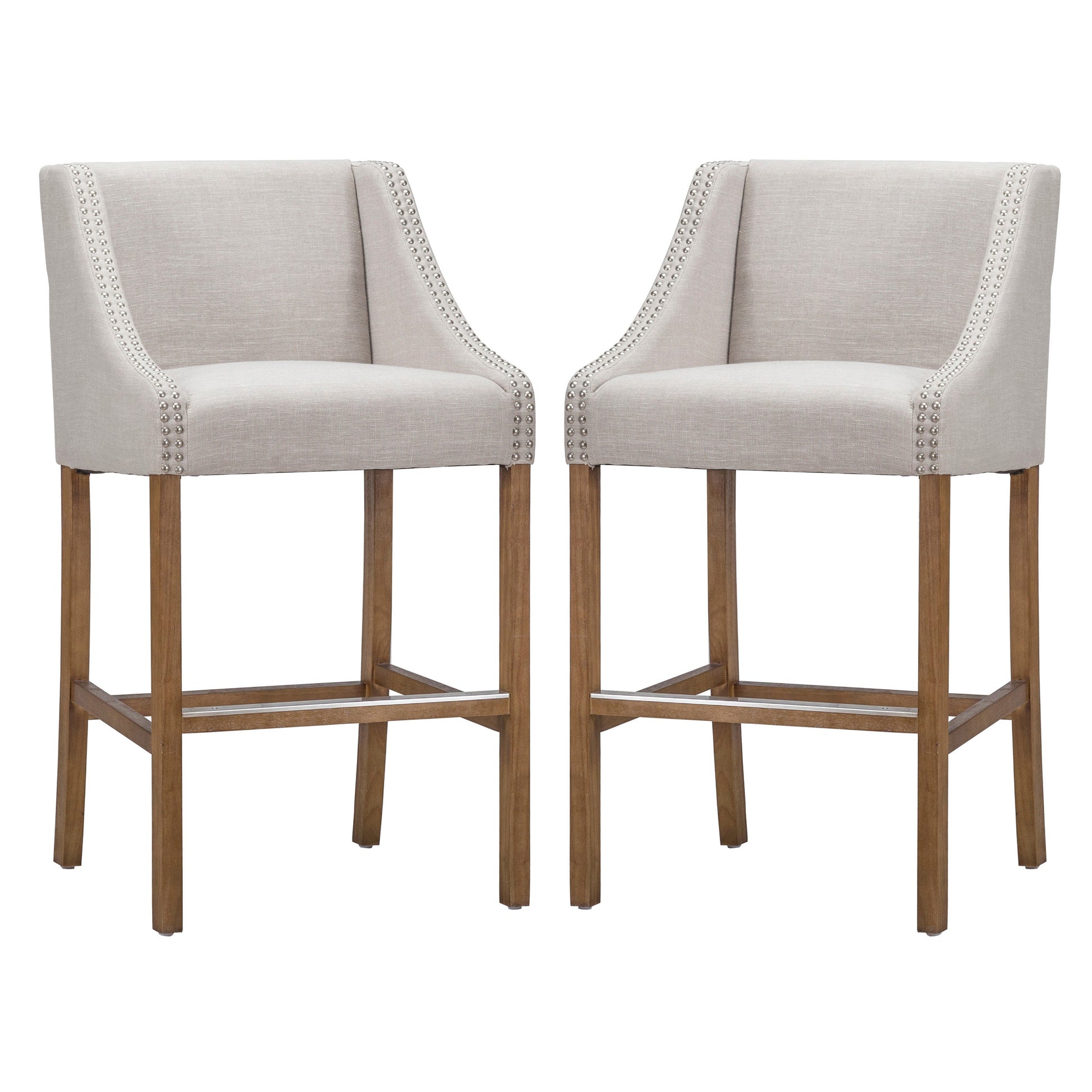 Wood And Fabric Barstool With Swooping Arms And Nail Head Trim, Set Of 2, Beige And Brown Beige Brown Wood Fabric