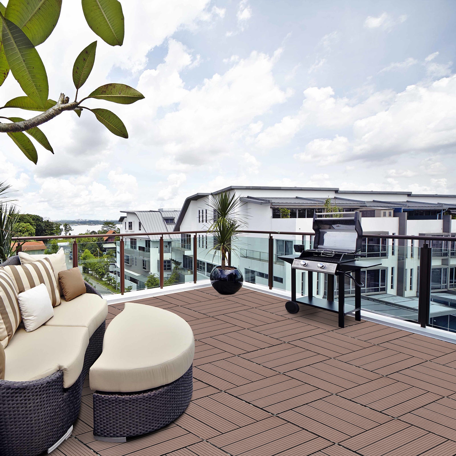 Wood Plastic Composite Deck Tiles Set Of 20, Sustainable Fsc Composite Decking Resist Rust, Water, Weather, Easy To Diy & Maintain, Ideal For Patios, Balconies, Rooftops, Coffee Color Coffee Wood Plastic