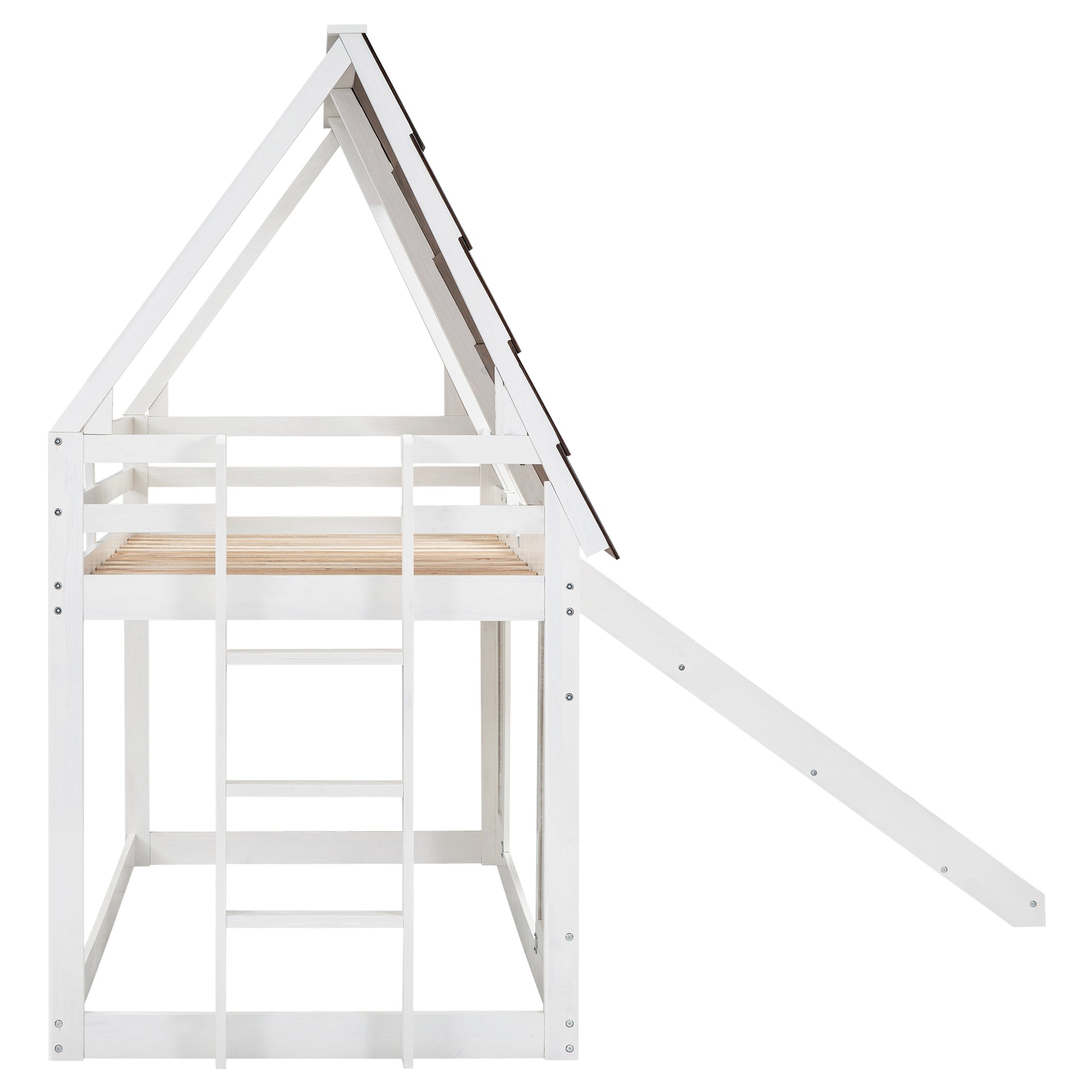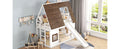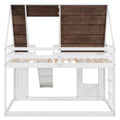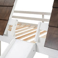 Wood Twin Size House Bunk Bed With Roof, Ladder And Slide, White Brown Box Spring Not Required Twin Brown White Wood Bedroom Pine Bunk Solid Wood Mdf