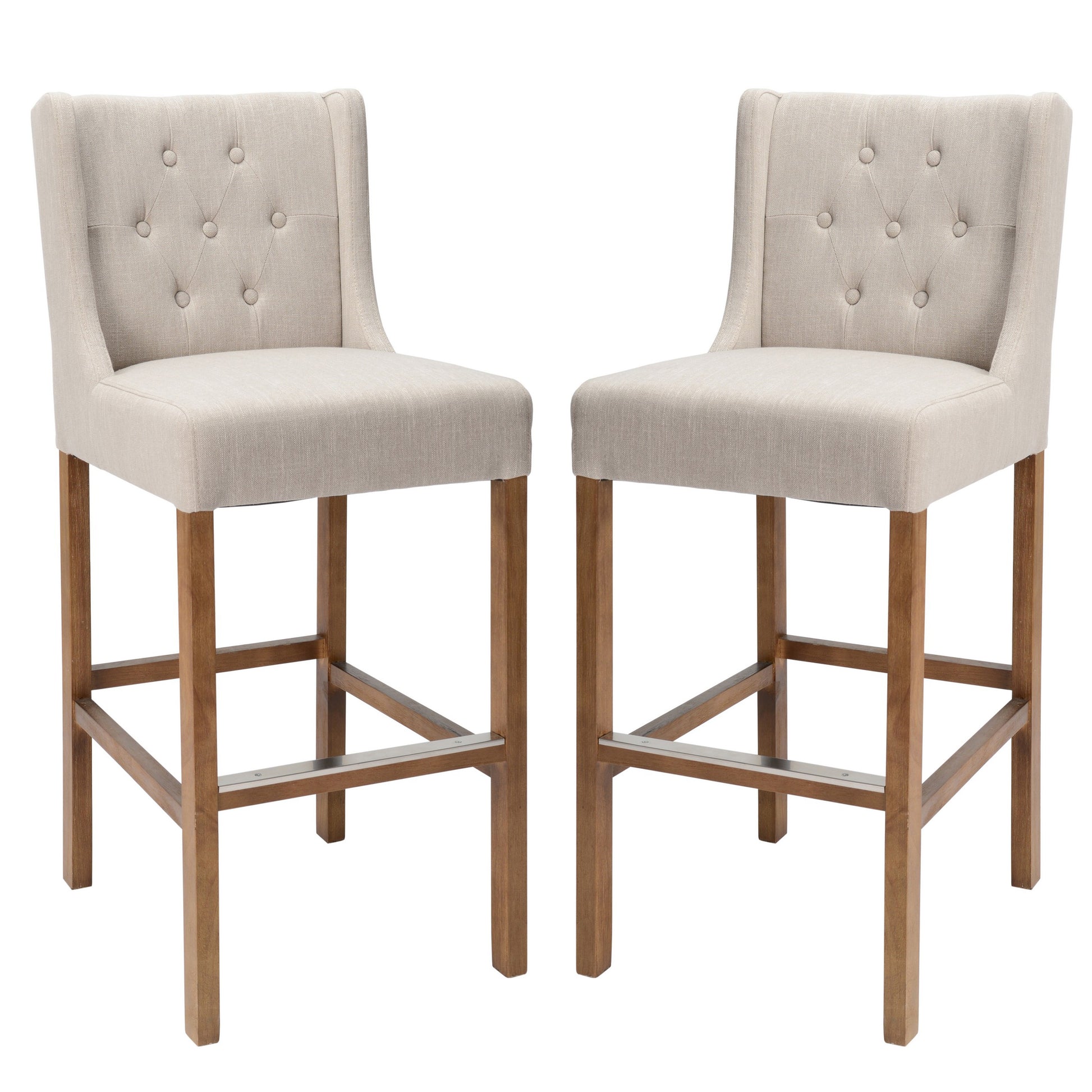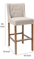 Wooden Barstool With Padded Seat, Button Tufted, Wing Back, Set Of 2, Beige And Brown Beige Brown Wood Fabric