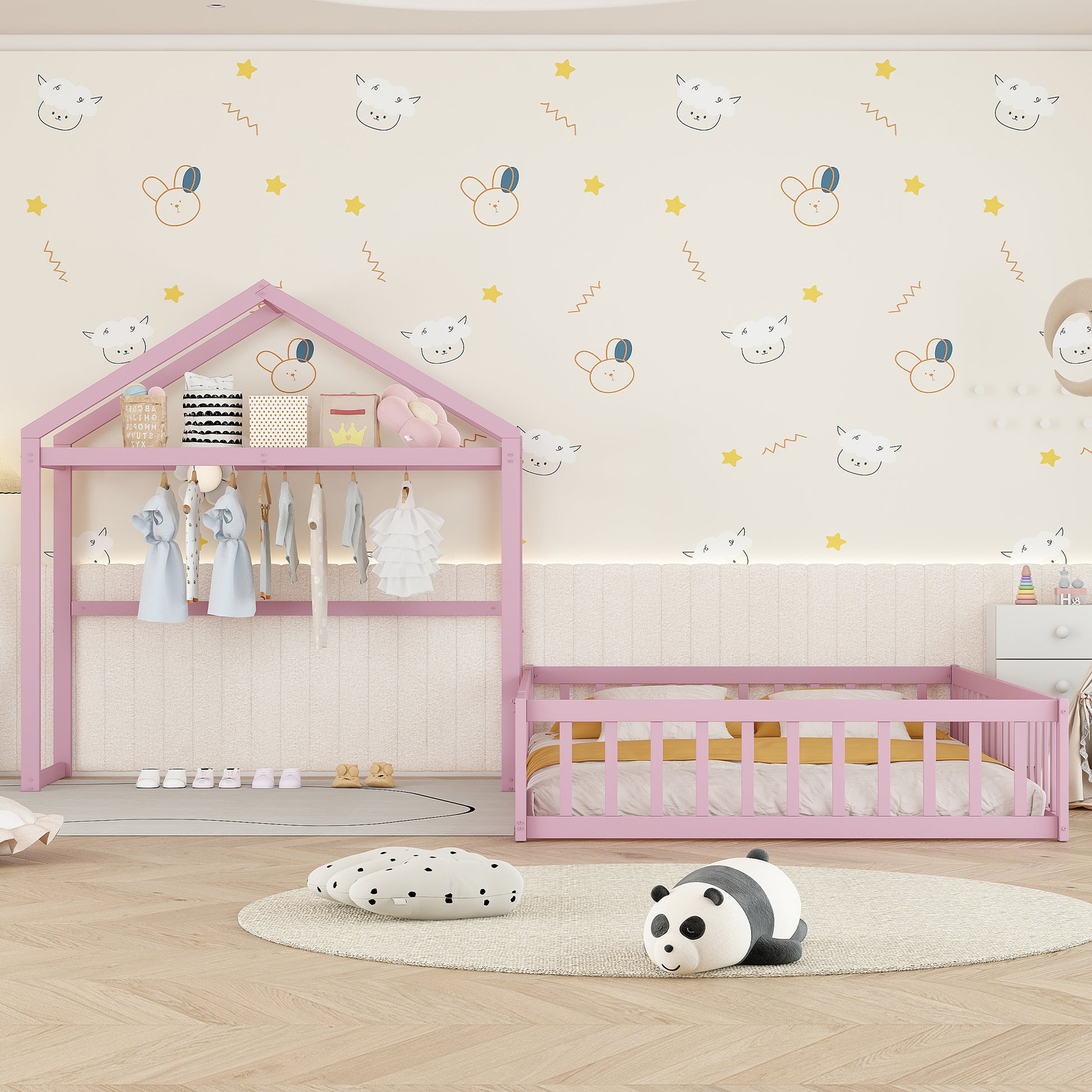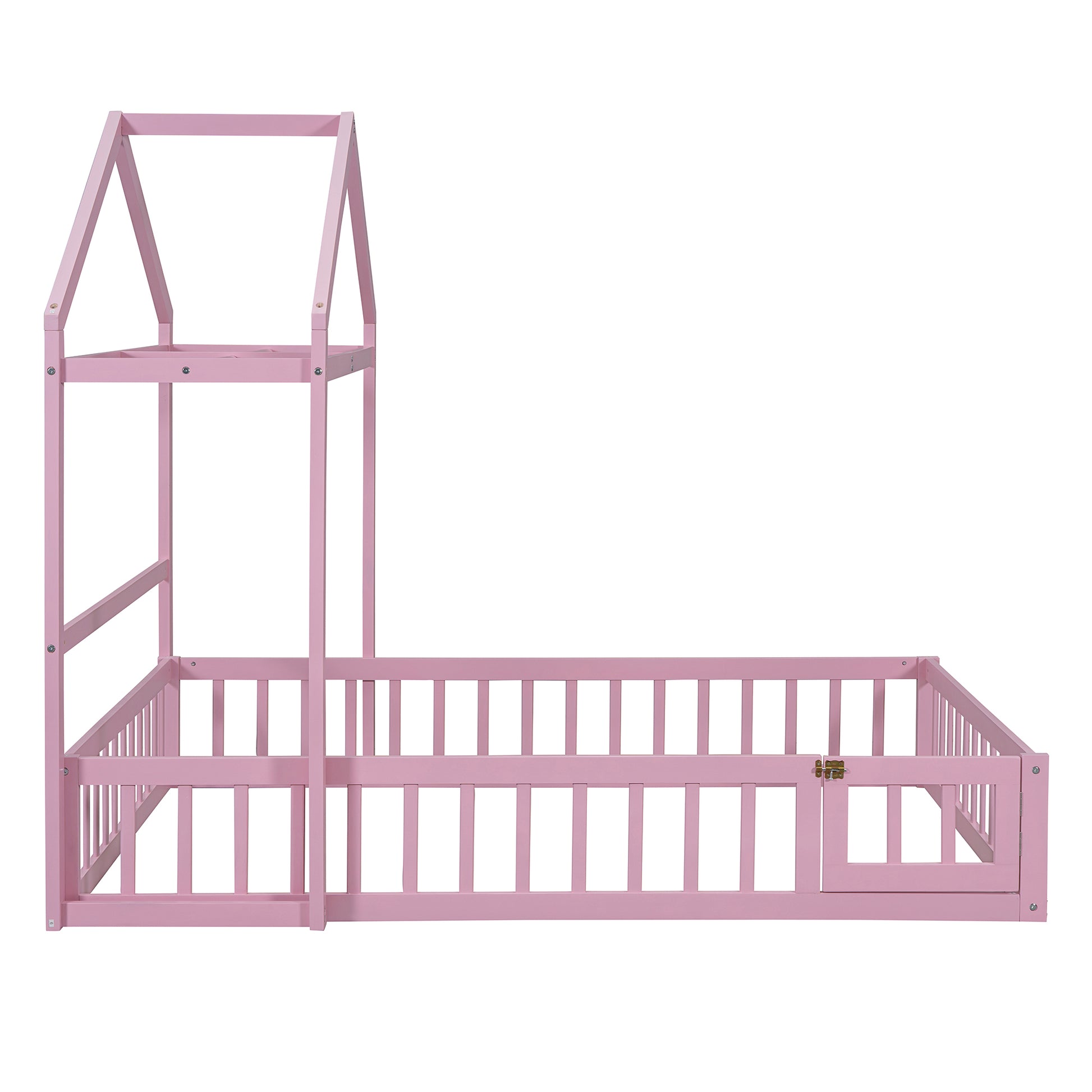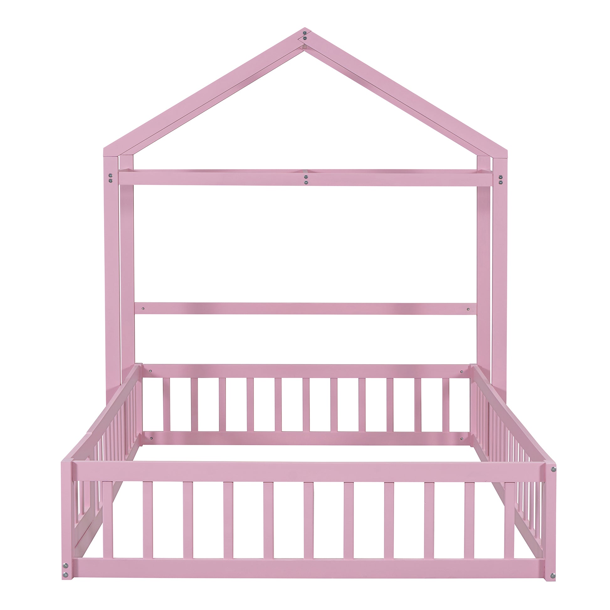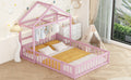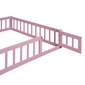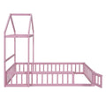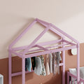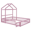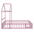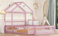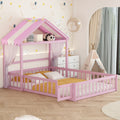 Wooden Floor Bed With Fence Railings And Detachable House Shape Headboard,Full Size Bed With Kids Dress Up Rack, Kids Montessori Style Playhouse Frame For Girls Boys, Pink Full Pink Wood