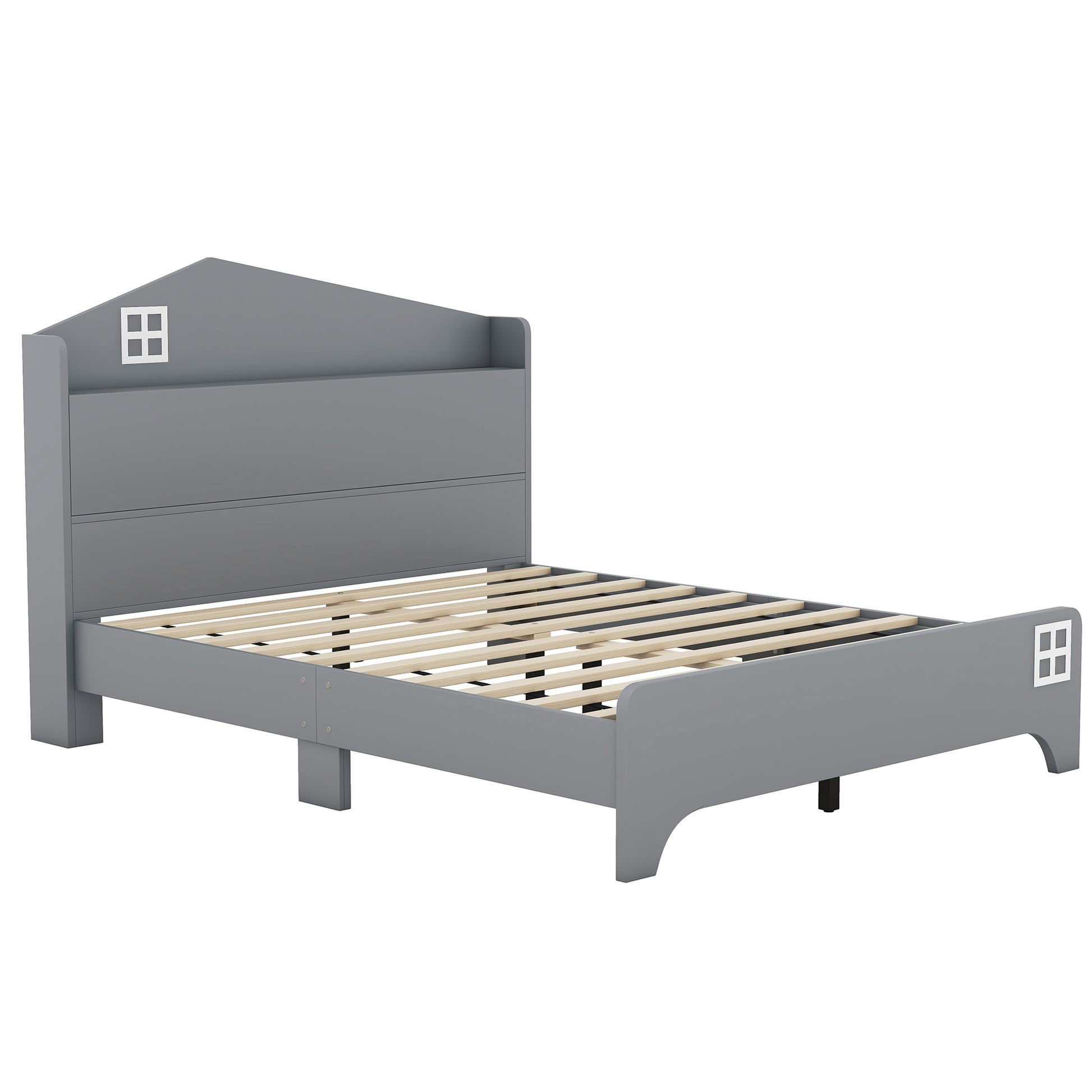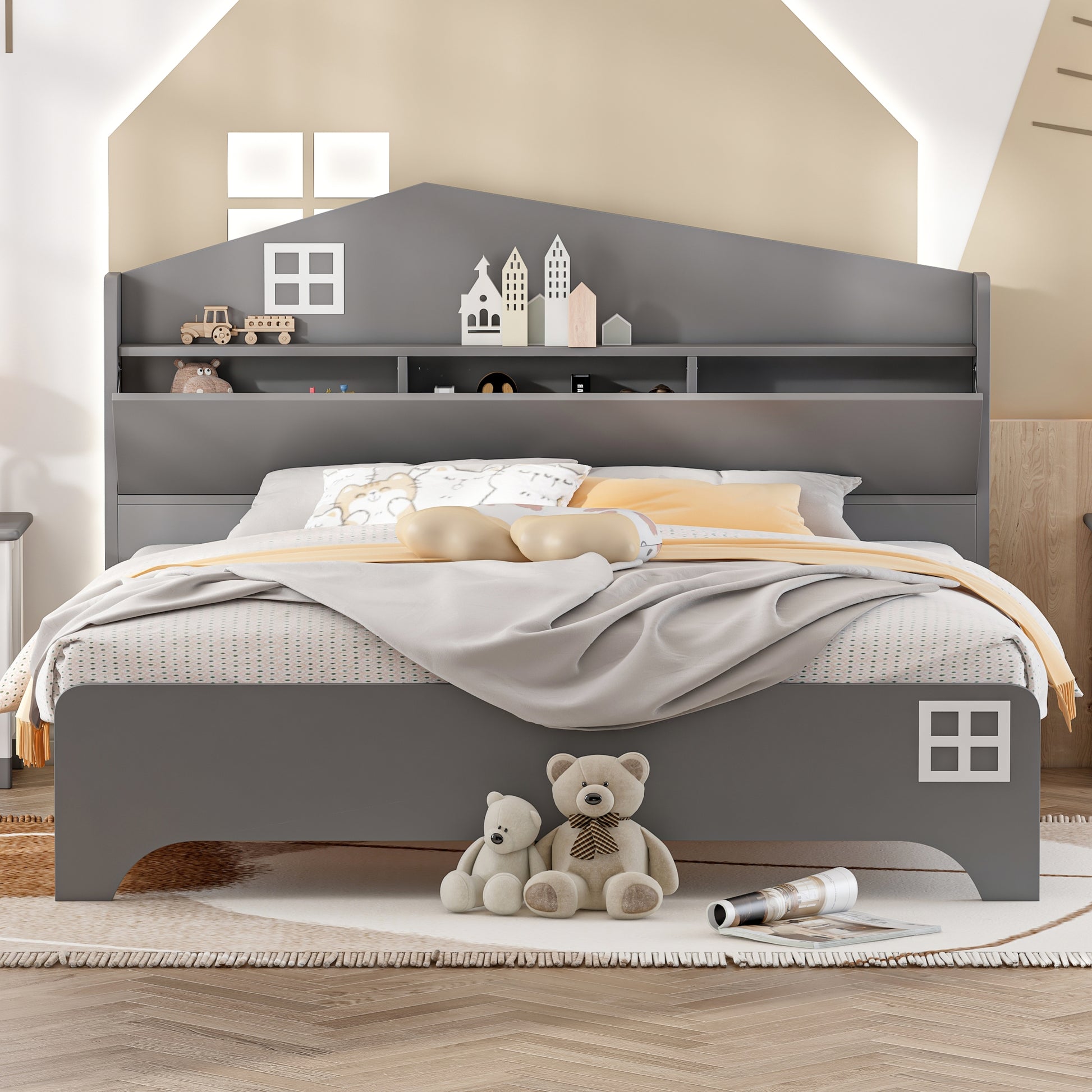 Wooden Full Size House Bed With Storage Headboard ,Kids Bed With Storage Shelf,Grey Grey Wood