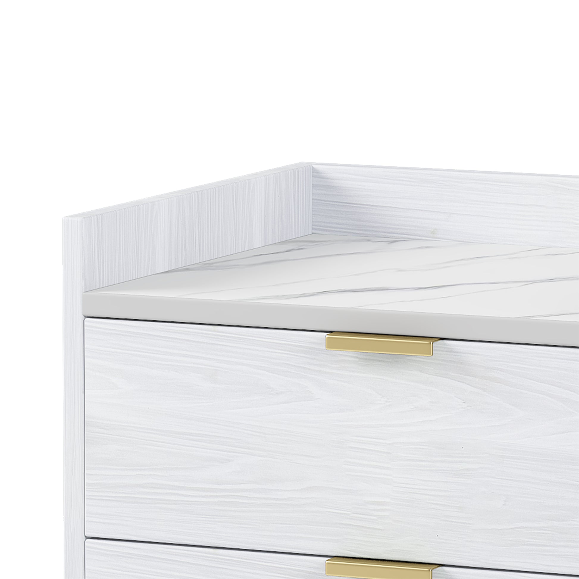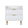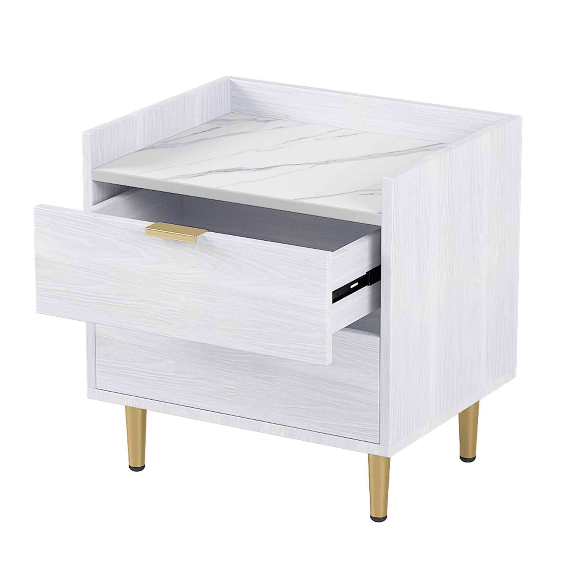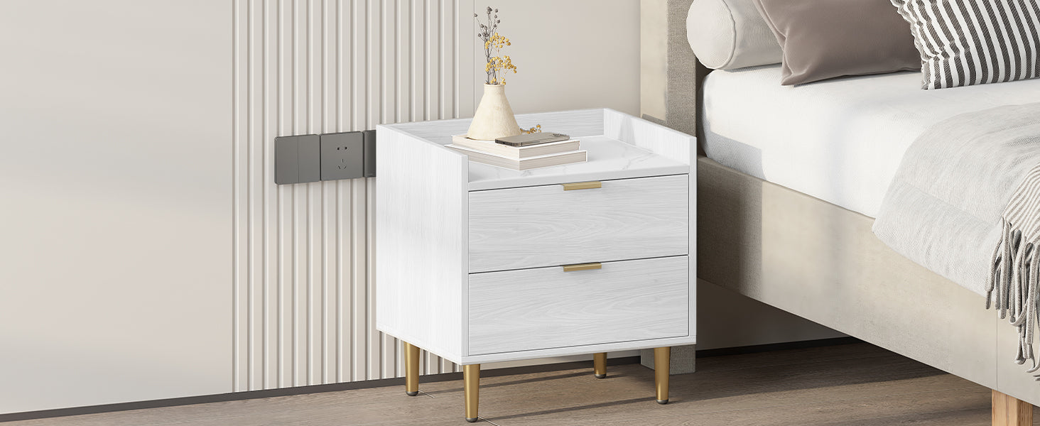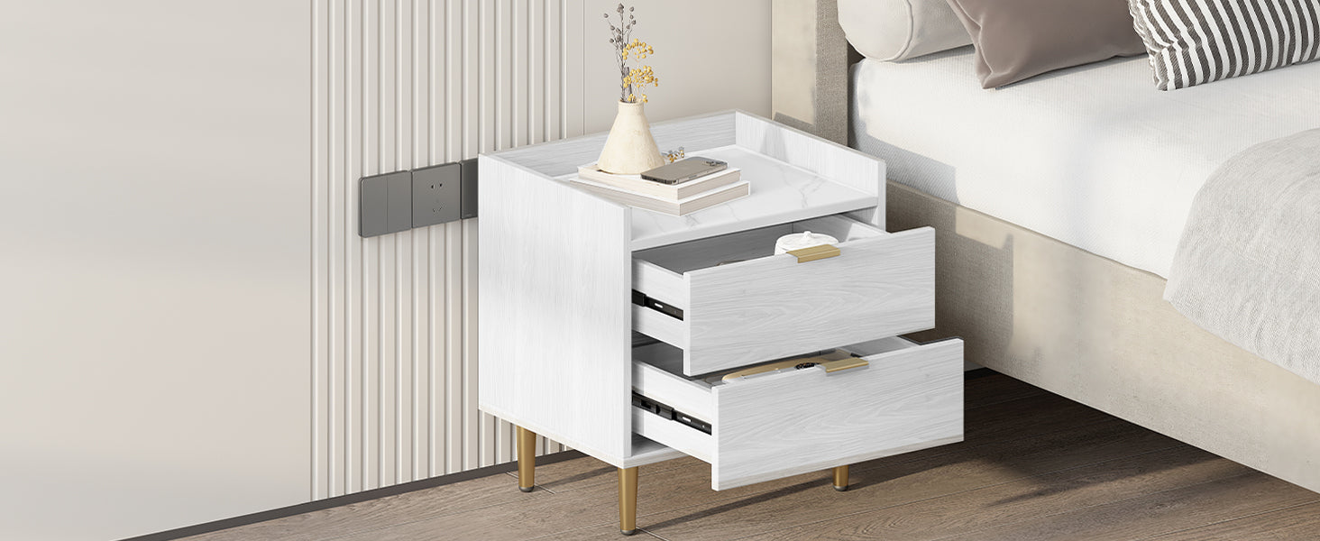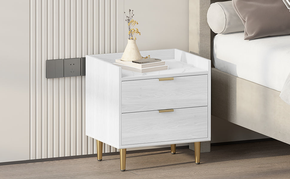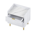 Wooden Nightstand With 2 Drawers And Marbling Worktop, Mordern Wood Bedside Table With Metal Legs&Handles,White White Mdf Metal