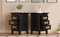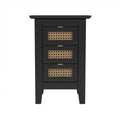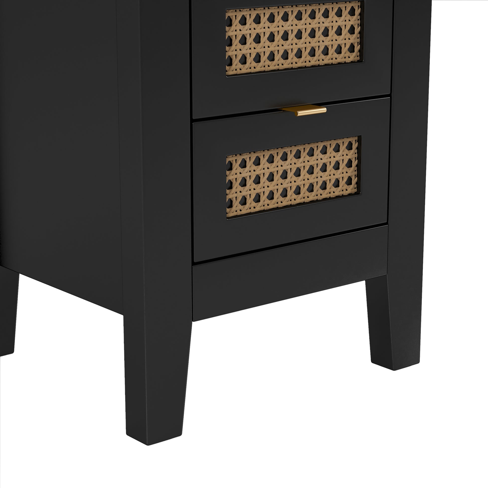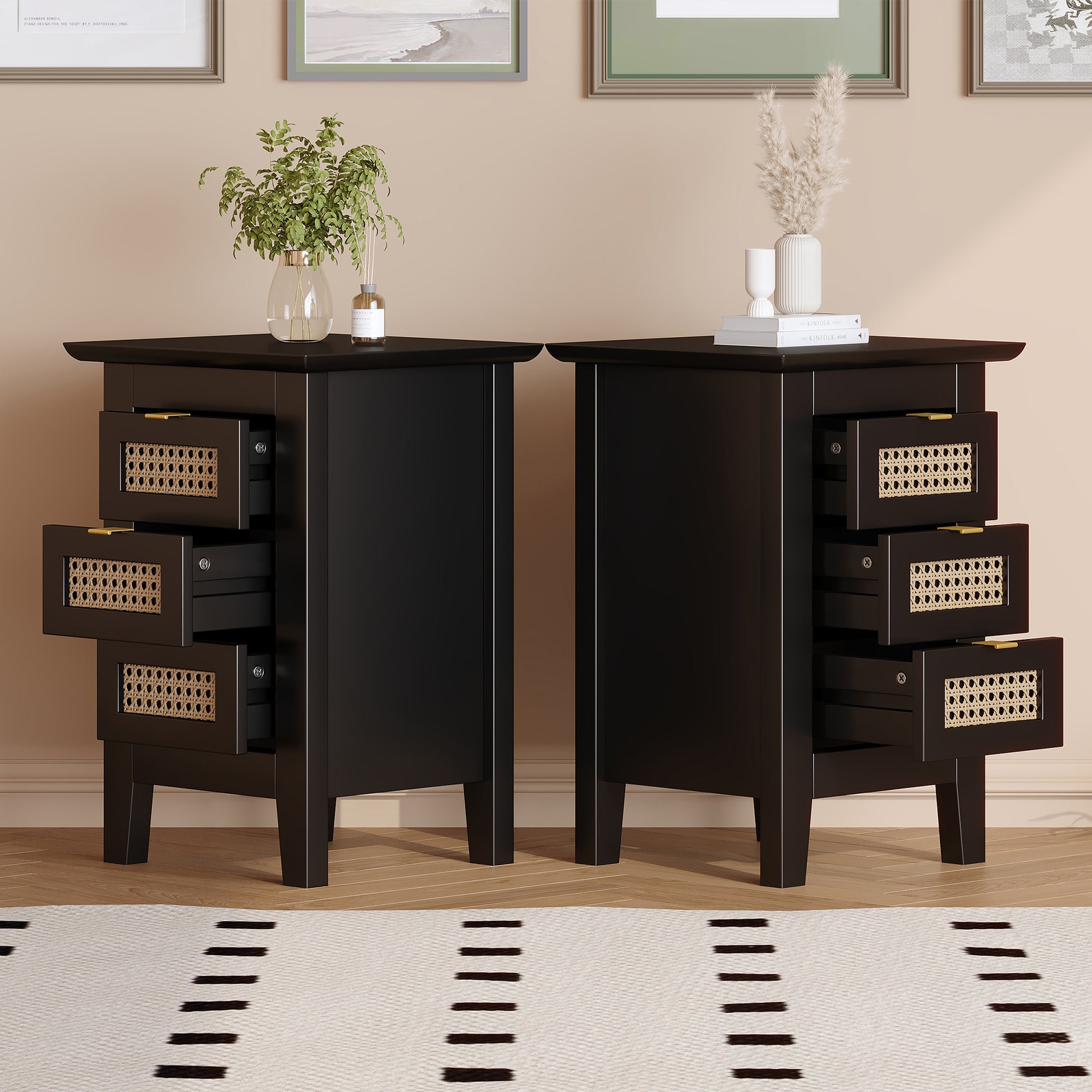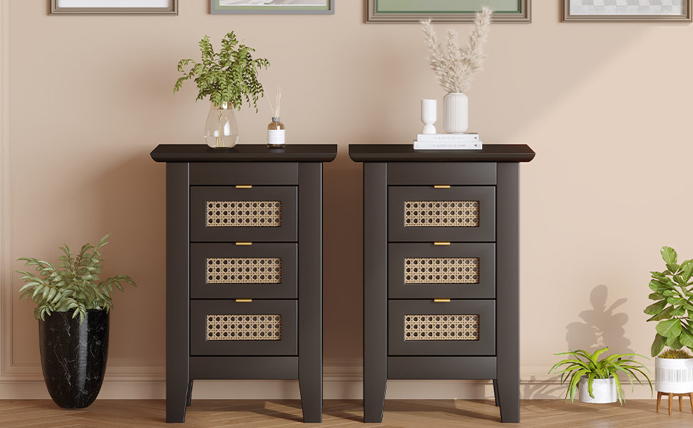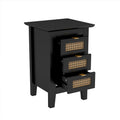 Wooden Nightstands Set Of 2 With Rattan Woven Surfaces And Three Drawers, Exquisite Elegance With Natural Storage Solutions For Bedroom, Black Black Particle Board