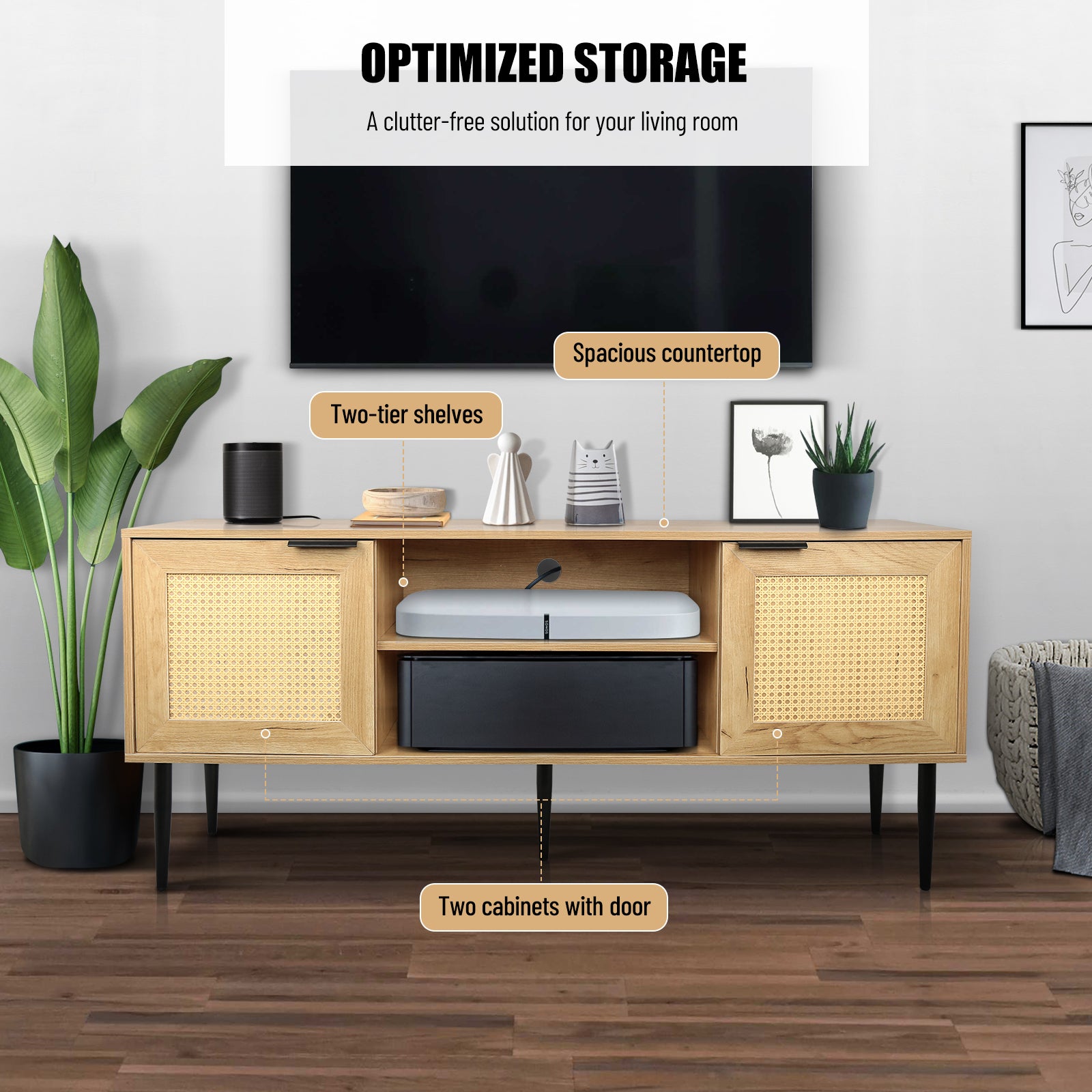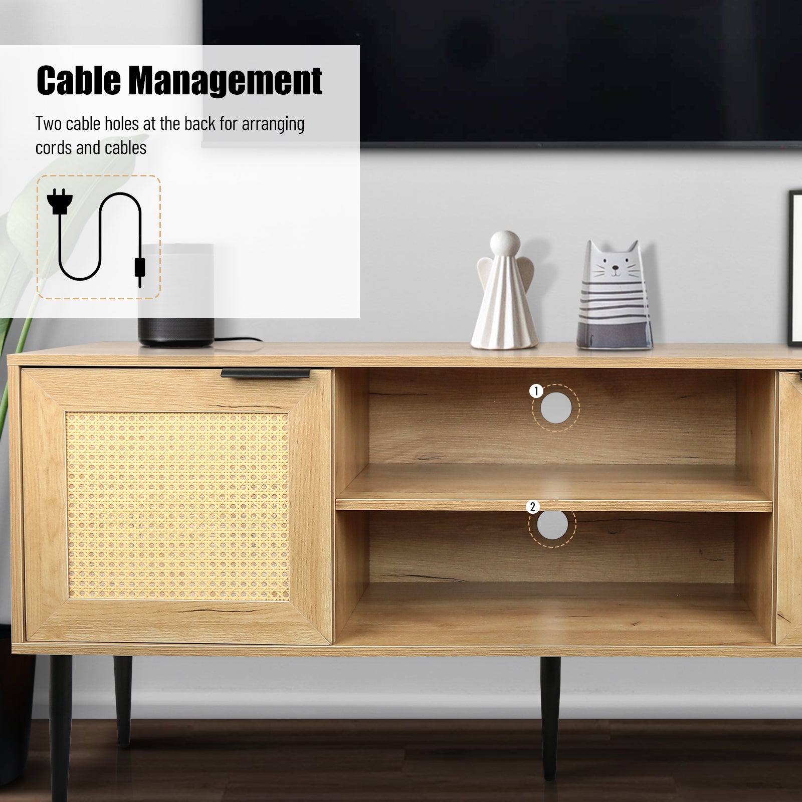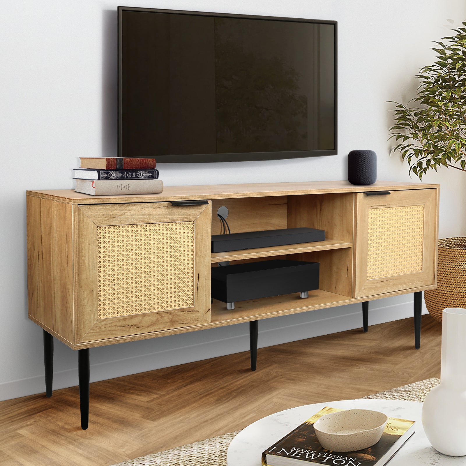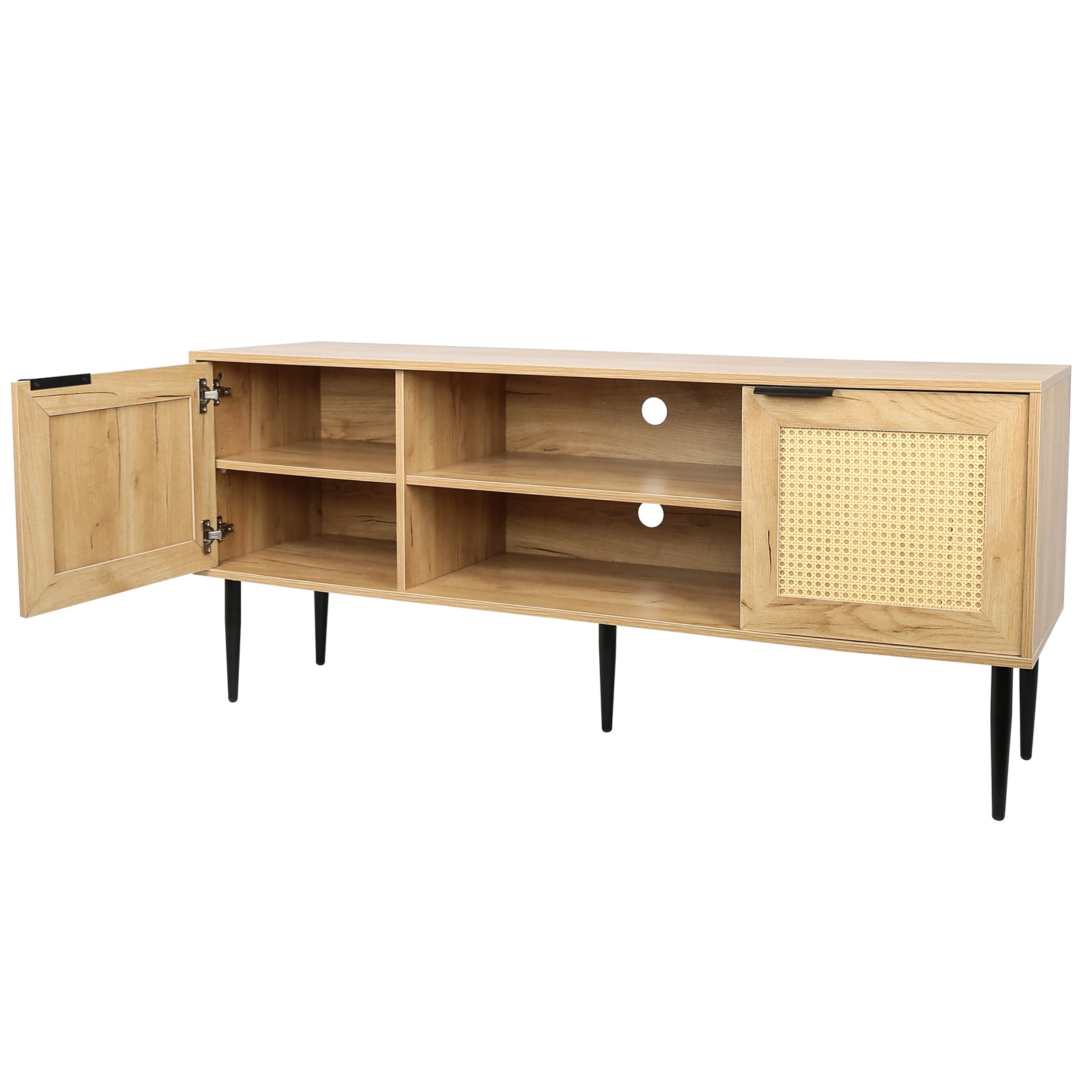 Wooden Tv Stand For Tvs Up To 65 Inches,With 2 Rattan Decorated Doors And 2 Open Shelves,Living Room Tv Console Table Wooden Entertainment Unit, Natural Color Natural Particle Board
