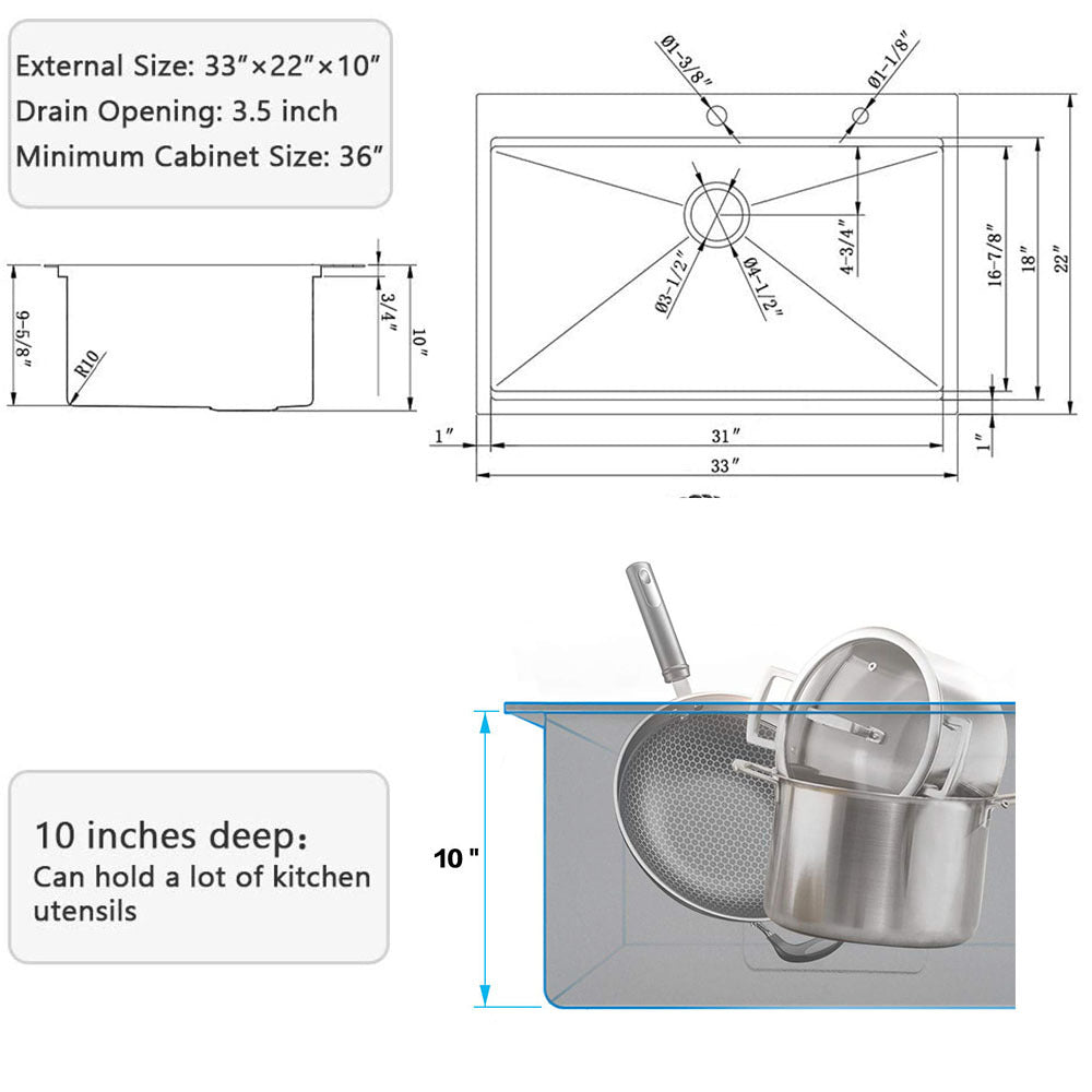 Workstation 33 Inch Drop In 16 Gauge Kitchen Sink R10 Radius Stainless Steel Kitchen Sink Single Bowl With Intergrated Ledge & Accessories Pack Of 5 33"X22"X10" Brushed Nickel Stainless Steel