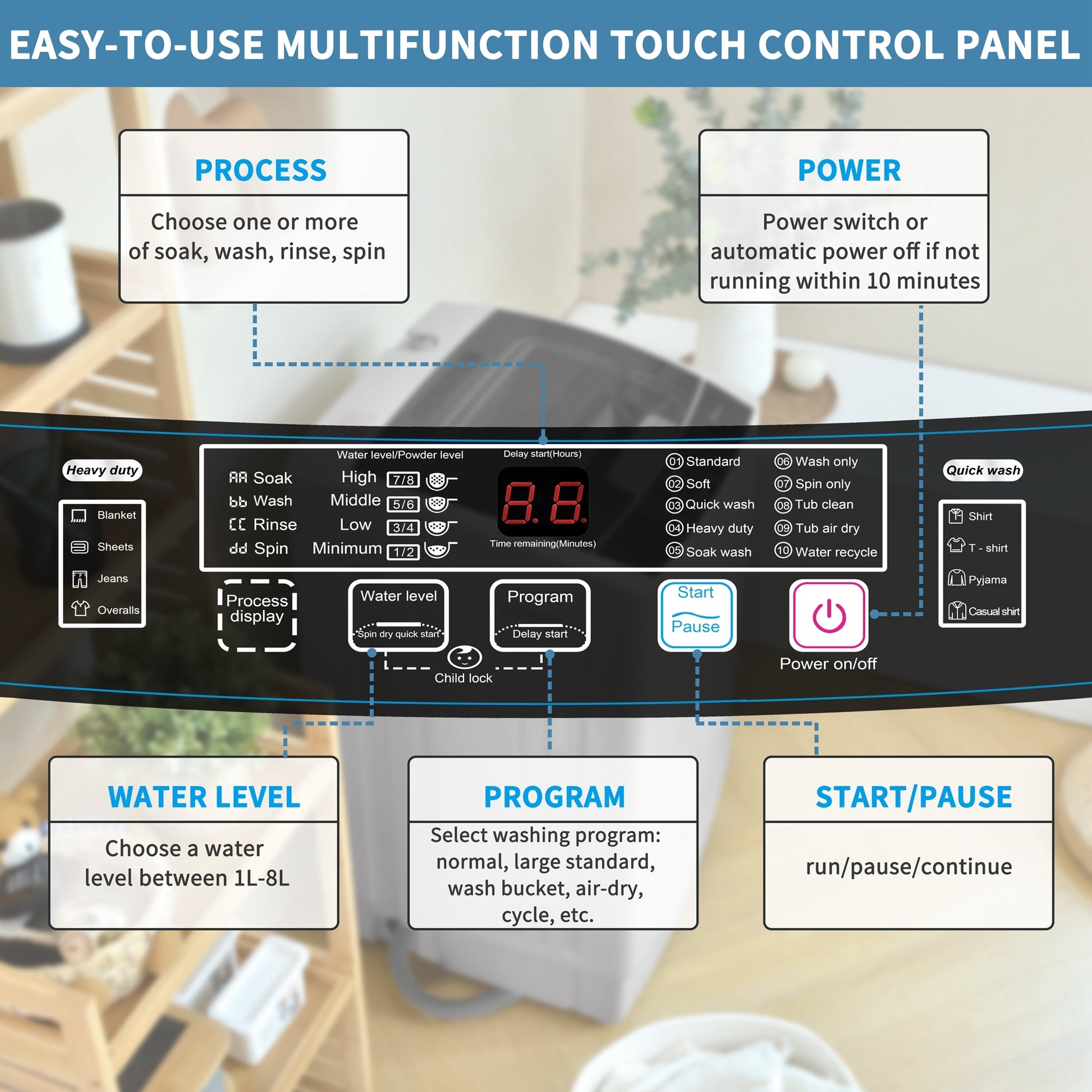 | Program | 10 programs(Standard/Soft/Quick wash/Heavy duty/Soak wash/Wash only/Spin only/Tub clean/Tub air dry/Water recycle) |