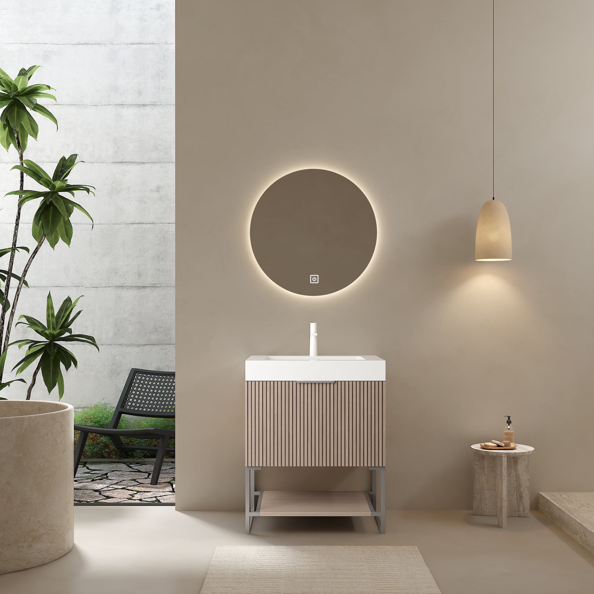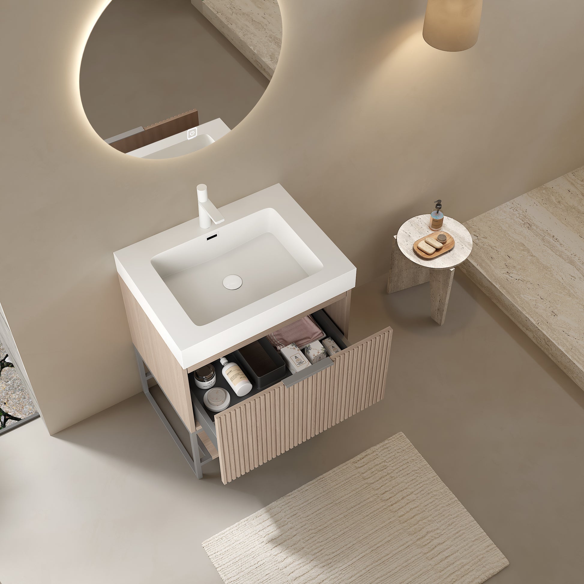 Yolan 24" Bathroom Vanity With Sink, Freestanding Plywood Striped Storage Cabinet With Drawer And Open Shelf, White Rectangular Acrylic Integrated Basin Without Faucet, Pre Assembled, Light Brown Oak Brown Oak,White Bathroom Modern Plywood Acrylic
